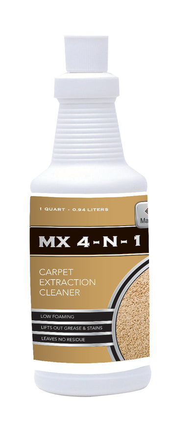 MX 4N1 is specially formulated high performance product composed of low foam detergents, sequestering agents and water soluble solvents. Formulated to provide maximum cleaning action in hot and cold water extraction units without leaving residue behind. Meets the highest standards in carpet extraction maintenance. Approximately 80% of all soils and greasy substances are caused by foot traffic and over half are of a greasy nature. Safe on all synthetic carpet fibers. Does not contain any optical brighteners. This product is an extraction cleaner that cleans the carpet fibers more thoroughly than any product on the market today. This product is most effective on carpets that have been previously treated with a mill-applied fluorochemical stain-resistant treatment. Vacuum carpet thoroughly. Test carpet for colorfastness in an inconspicuous area before any method of cleaning.